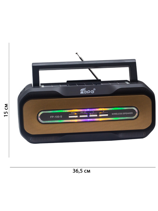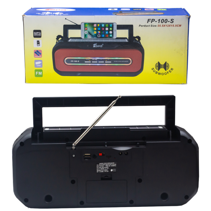FP-100-S, бренд EPE – портативная акустика 25 Вт с FM радио, Bluetooth и солнечной панелью.
