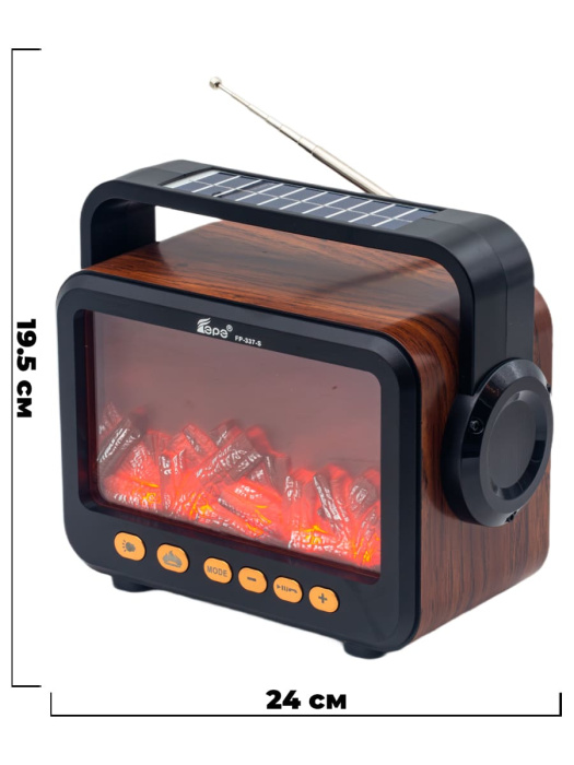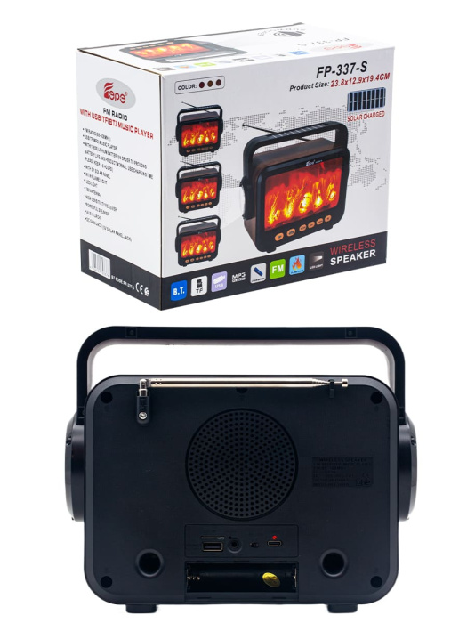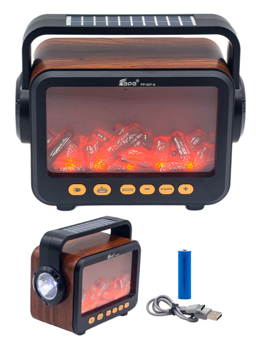 FP-337-S, бренд EPE – стильный портативный радиоприемник в дизайне «камин» с разноцветной подсветкой, FM радио, цифровым тюнером, мощным динамиком 8 Вт, солнечной панелью и фонариком.