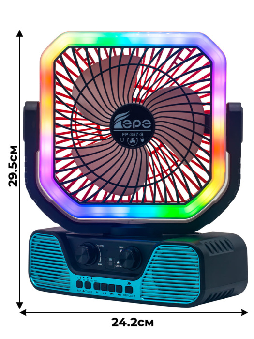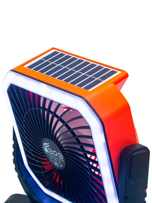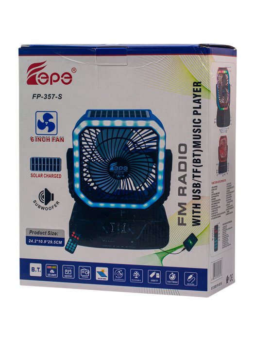 FP-357-S, бренд EPE – многофункциональный портативный радиоприемник с FM радио, Bluetooth, мощным динамиком 7,5 Вт, солнечной панелью, фонариком, вентилятором и пультом ДУ.