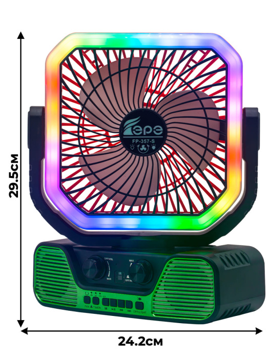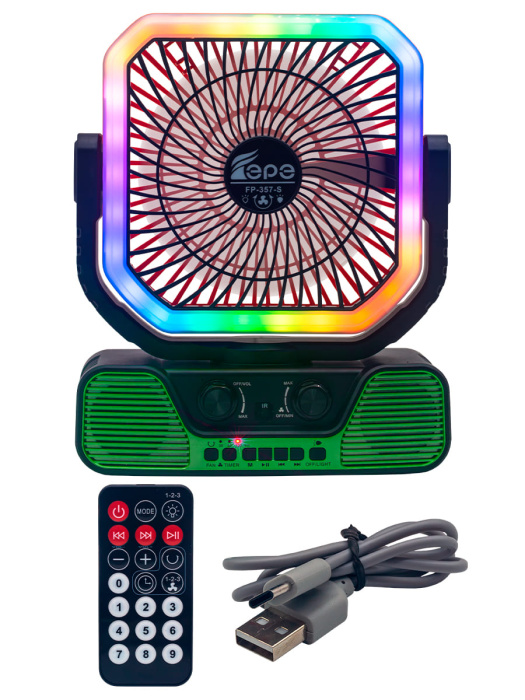 FP-357-S, бренд EPE – многофункциональный портативный радиоприемник с FM радио, Bluetooth, мощным динамиком 7,5 Вт, солнечной панелью, фонариком, вентилятором и пультом ДУ.
