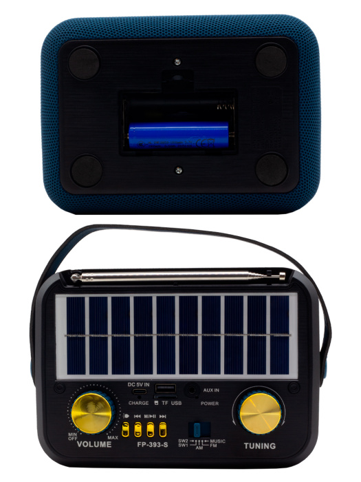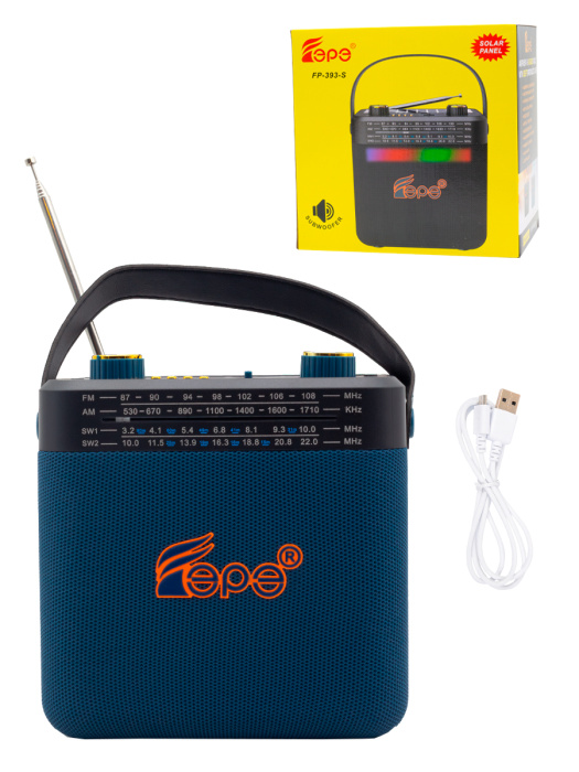 FP-393-S, бренд EPE – портативный многодиапазонный радиоприемник с FM/AM/SW радио, мощным динамиком 11 Вт, Bluetooth, солнечной панелью и декоративной светодиодной подсветкой.