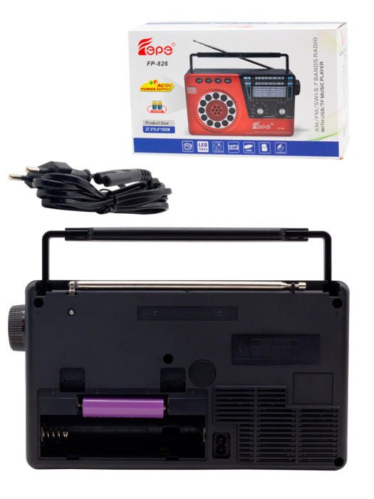 FP-826, бренд EPE – портативный многодиапазонный радиоприемник с FM/AM/SW радио (7 диапазонов), Bluetooth, входом для наушников, динамиком 3 Вт и аккумулятором 18650.