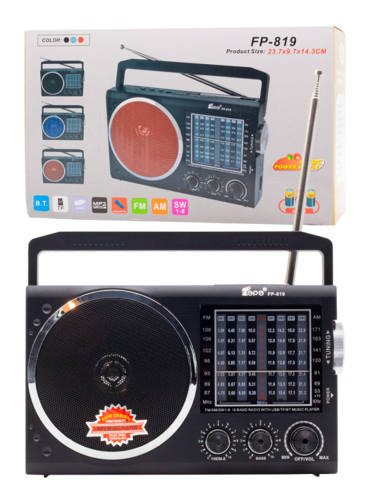FP-819, бренд EPE – портативный многодиапазонный радиоприемник для настоящих радиолюбителей: FM/AM и 8 диапазонов SW (короткие волны), мощный динамик 3,4 Вт, регуляторы басов и высоких частот, Bluetooth и аккумулятор 18650.