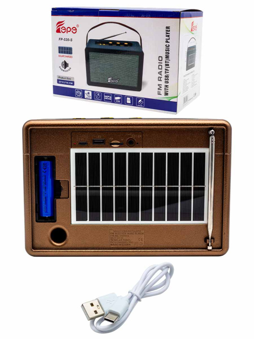 FP-530-S, бренд EPE – мощный портативный радиоприемник с FM радио, динамиком 12,8 Вт, регуляторами басов и высоких частот, Bluetooth, солнечной панелью и аккумулятором 18650.