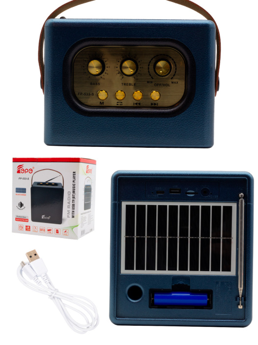 FP-533-S, бренд EPE – мощный портативный радиоприемник с FM радио, цифровым тюнером, динамиком 12 Вт, регуляторами басов и высоких частот, Bluetooth и солнечной панелью.