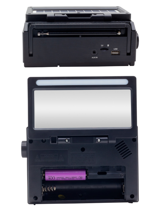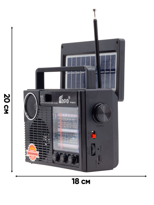 FP-601-S, бренд EPE – портативный многодиапазонный радиоприемник с FM/AM/SW радио (7 диапазонов), цифровым тюнером, Bluetooth, солнечной панелью, фонариком и зеркалом.