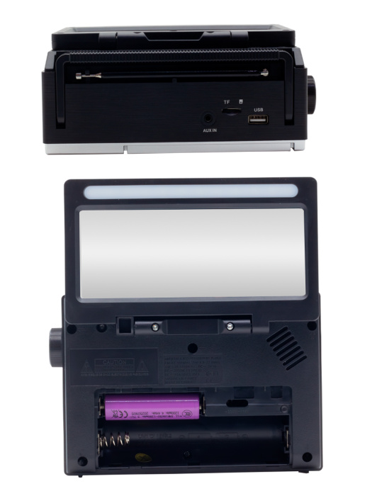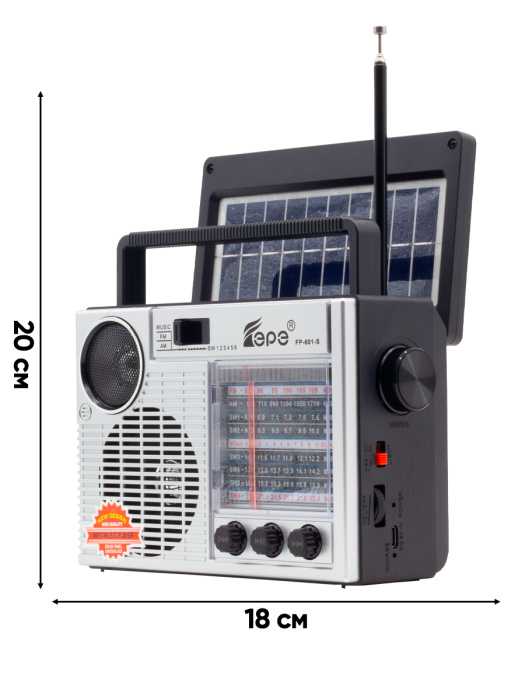 FP-601-S, бренд EPE – портативный многодиапазонный радиоприемник с FM/AM/SW радио (7 диапазонов), цифровым тюнером, Bluetooth, солнечной панелью, фонариком и зеркалом.