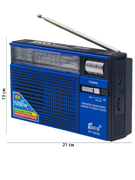 FP-1823U, бренд EPE – портативный радиоприемник с тремя диапазонами AM/FM/SW, USB и TF разъемами, аналоговым тюнером и мощным динамиком.