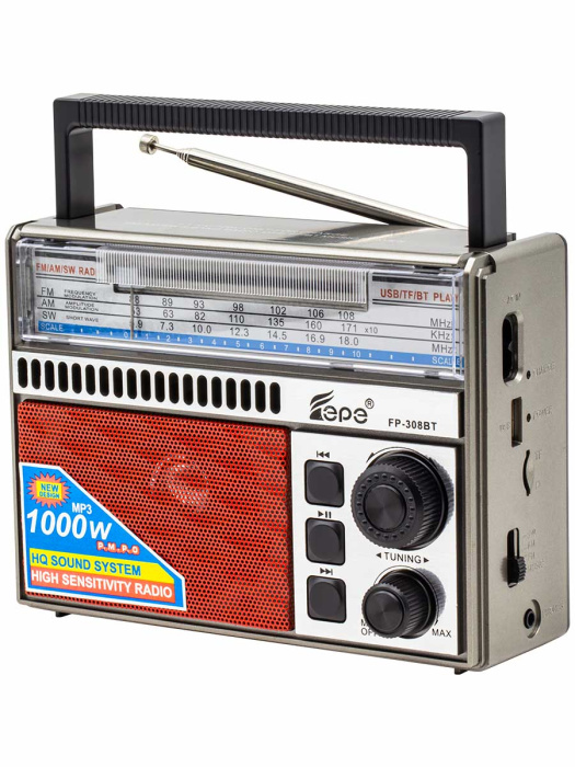 FP-308BT, бренд EPE – портативный радиоприемник с тремя диапазонами AM/FM/SW, Bluetooth, разъемом для наушников, USB/TF и мощным динамиком 3 Вт.