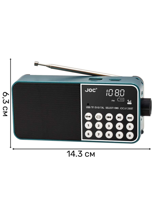 JOC6128BT, бренд JOC – ультракомпактный портативный радиоприемник с FM радио, цифровым тюнером, запоминанием станций, динамиком 5 Вт, Bluetooth, фонариком, аккумулятором 18650 и ремешком для переноски.