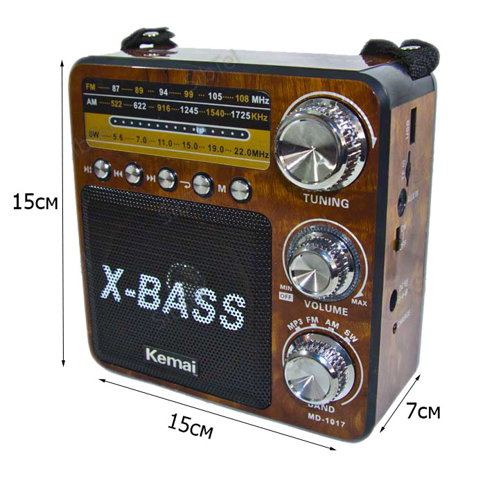 Радиоприемники Kemai MD-1017U по-прежнему остаются одним из главных источников новостей. Они радуют нас уже полюбившейся и новой музыкой, помогают расслабиться и поднять настроение. Отдельный, а не встроенный радиоприемник более мобилен и удобен при транспортировке. Чтобы купить хороший радиоприемник, необходимо определиться с его целевым назначением и решить, какие радиостанции он должен принимать – отечественные или еще и зарубежные. Исходя из этого выбирается частотный диапазон устройства и ряд других параметров. От спектра радиочастот зависит количество радиостанций, улавливаемых радиоприемником. Популярные российские радиостанции находятся в диапазоне 88–108 МГц. Для прослушивания радио за городом необходим приемник, включающий FM-диапазон 64–78 МГц. Чтобы устройство ловило иностранные радиостанции, оно должно принимать диапазон AM. Качество звука зависит от количества динамиков. Стереозвучание обеспечивают радиоприемники с двумя динамиками. Есть также модели с одним динамиком, которые выдают звучание умеренного качества, зато стоимость их ниже. Тип антенны влияет на качество приема. Портативные модели используют телескопическую антенну, которая дает уверенный прием. Модели со встроенной антенной более надежные. Работают радиоприемники от сети и на батарейках. Размер и количество батареек определяется мощностью приемника. Производятся приемники, использующие в качестве источника питания аккумулятор. Идеальным принято считать тот радиоприемник, который работает и от сети, и на батарейках. Это позволяет экономить заряд батареек, когда под рукой есть розетка. В нашем каталоге представлено множество доступных по цене моделей, из-за чего вопроса, где купить радиоприемник, не возникает. Хорошим качеством и невысокой стоимостью отличаются модели WAXIBA (ВАКСИБО), KIPO (КИПО) и MAIER (Майер). Мировые гиганты вроде Philips (Филипс) и Sony (Сони) тоже выпускают радиоприемники высокого качества, хотя их модельный ряд несколько ограничен.