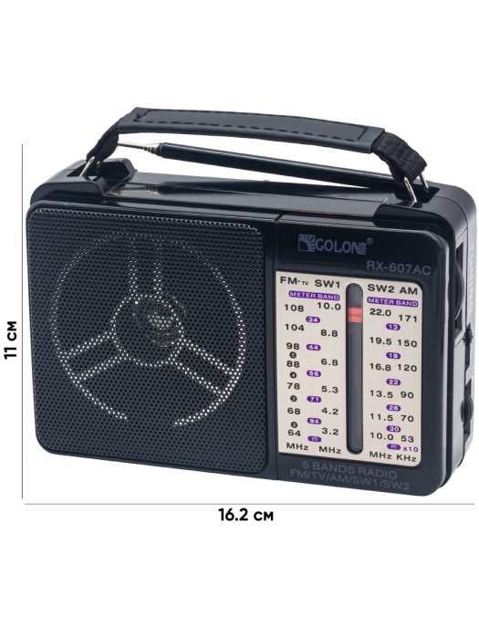 Размер радиоприемника: 16 x 5 x 11 см – компактный, поместится в рюкзак или ящик.